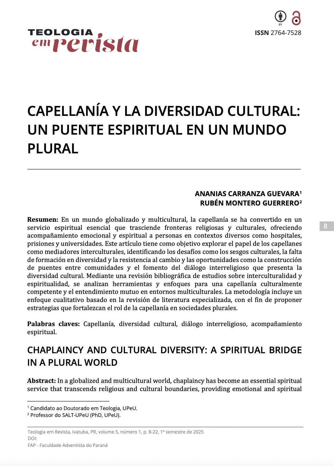 En un mundo globalizado y multicultural, la capellanía se ha convertido en un servicio espiritual esencial que trasciende fronteras religiosas y culturales, ofreciendo acompañamiento emocional y espiritual a personas en contextos diversos como hospitales, prisiones y universidades. Este artículo tiene como objetivo explorar el papel de los capellanes como mediadores interculturales, identificando los desafíos como los sesgos culturales, la falta de formación en diversidad y la resistencia al cambio y las oportunidades como la construcción de puentes entre comunidades y el fomento del diálogo interreligioso que presenta la diversidad cultural. Mediante una revisión bibliográfica de estudios sobre interculturalidad y espiritualidad, se analizan herramientas y enfoques para una capellanía culturalmente competente y el entendimiento mutuo en entornos multiculturales. La metodología incluye un enfoque cualitativo basado en la revisión de literatura especializada, con el fin de proponer estrategias que fortalezcan el rol de la capellanía en sociedades plurales.